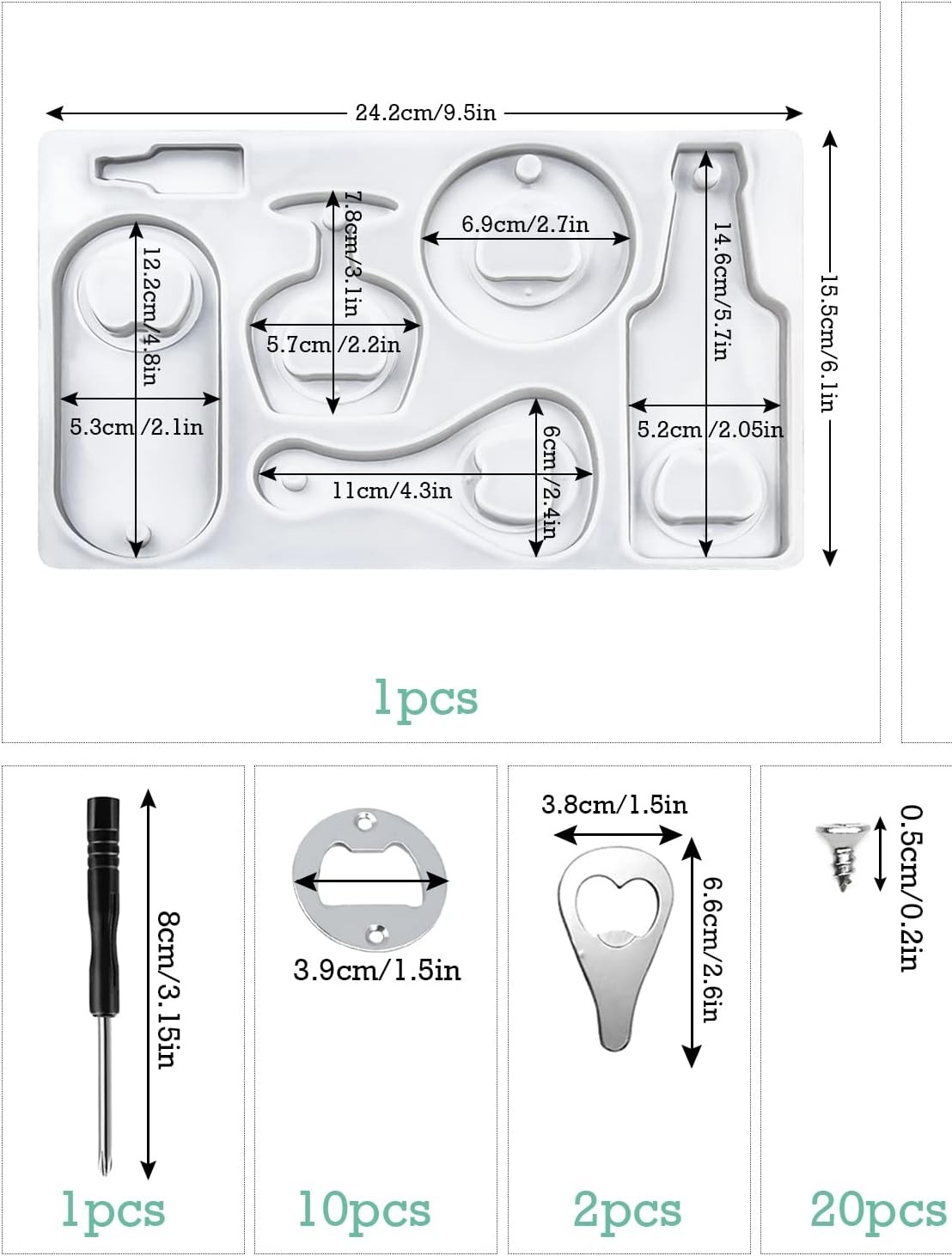 Setul include cavități în diverse forme – sticlă, pahar, capace rotunde, accesorii decorative – precum și unelte și piese metalice necesare ansamblării deschizătoarelor funcționale. Dimensiunile variate oferă versatilitate, permițând realizarea unor modele adaptate atât utilizării practice, cât și scopurilor decorative.